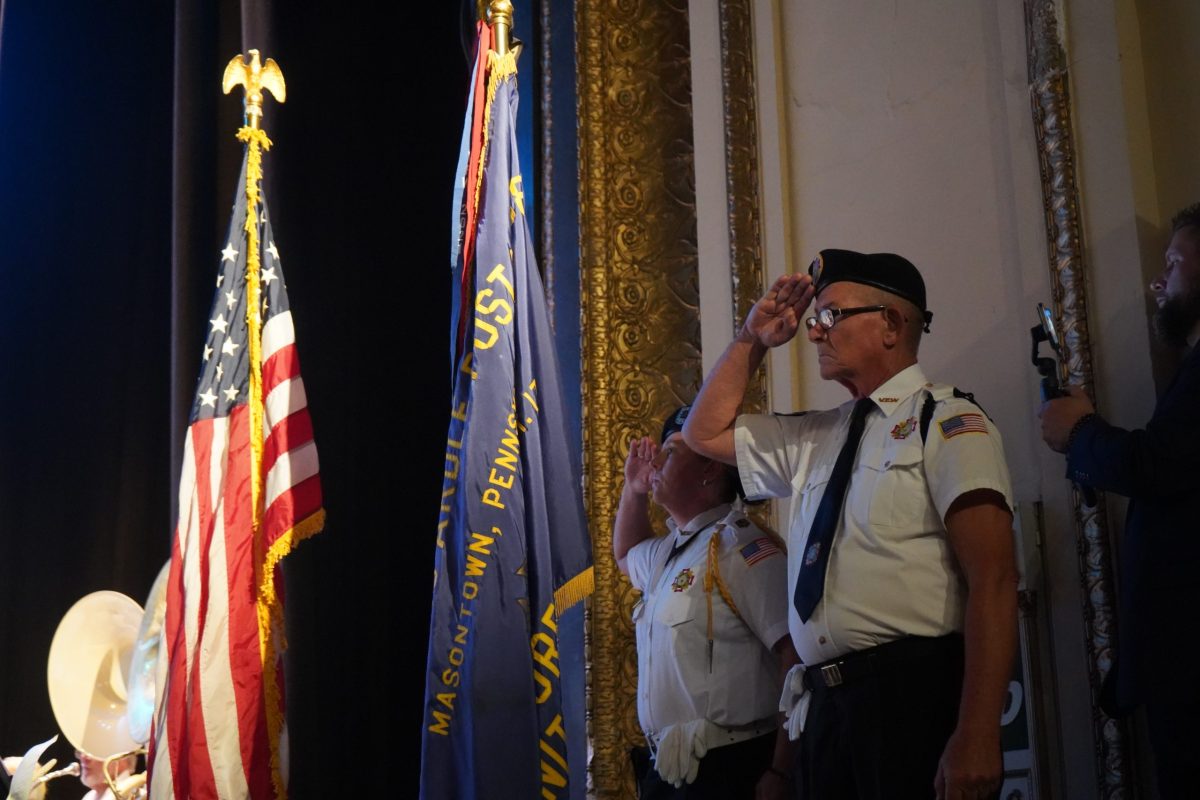 The patriotic ceremony which took place at the State Theatre Center For the Arts in downtown Uniontown featured songs and people from the local and state legislature along with musical performances performed by the VFW band from Post 8543.