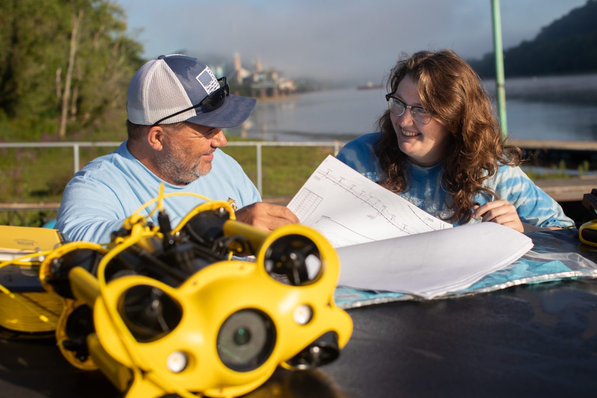 Dr. David Argent and Kris Clark review plans to place the underwater drone in the Monongahela River.