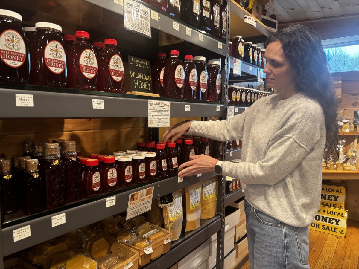 Sara Bedillion, co-owner of Bedillion Honey Farm, arranges bottles of honey at the store in Hickory. [File photo]