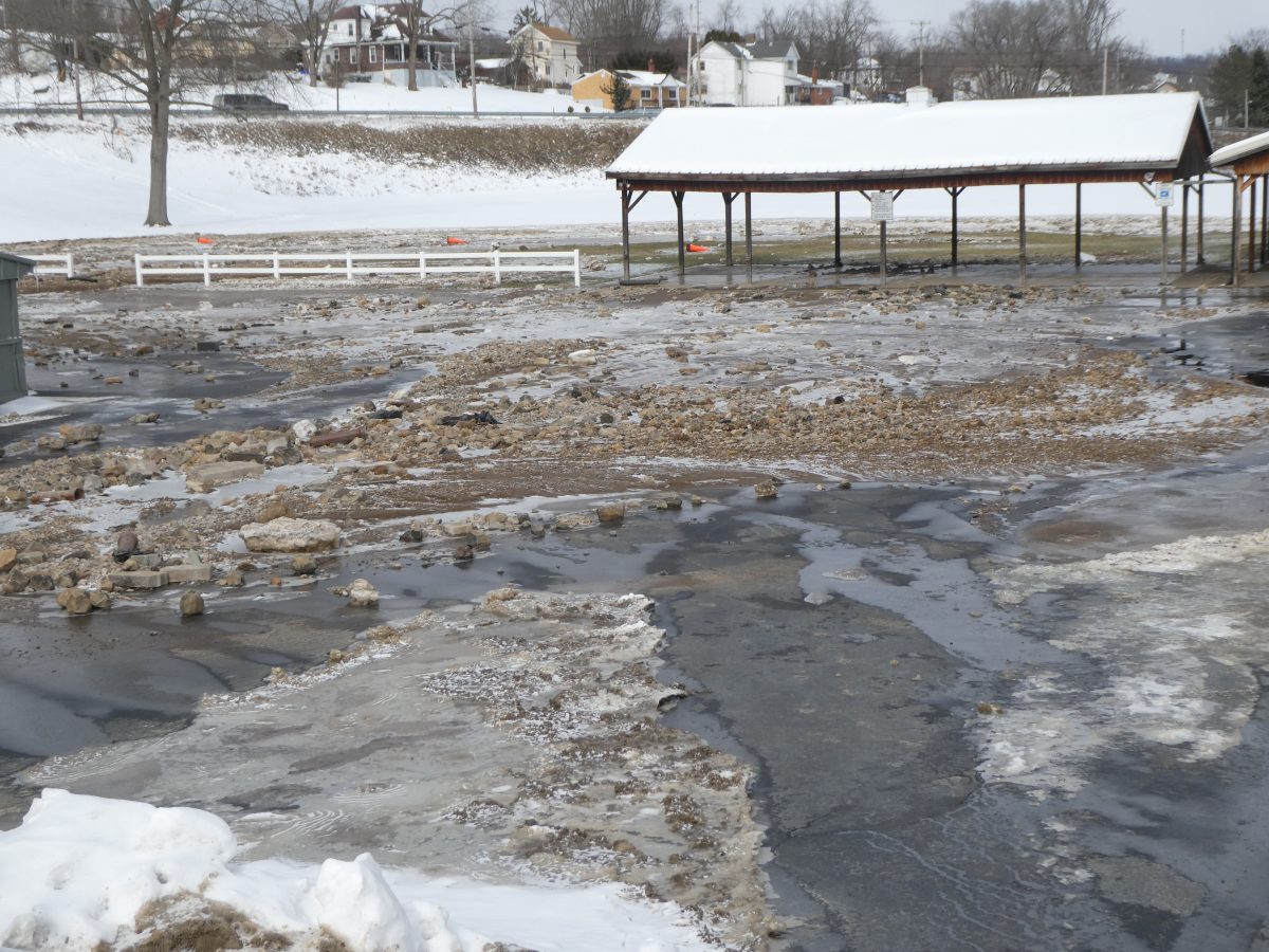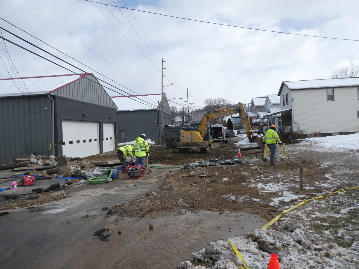 “The water just came flooding out,” Powell said Saturday afternoon. “There was water running through the fire hall to the back of the building and flooding the Elrama Tavern parking lot. We’re going to be without water for about another 15 hours probably. I just feel bad for these guys doing the work. It’s awful cold, and there’s no way to get warm.”