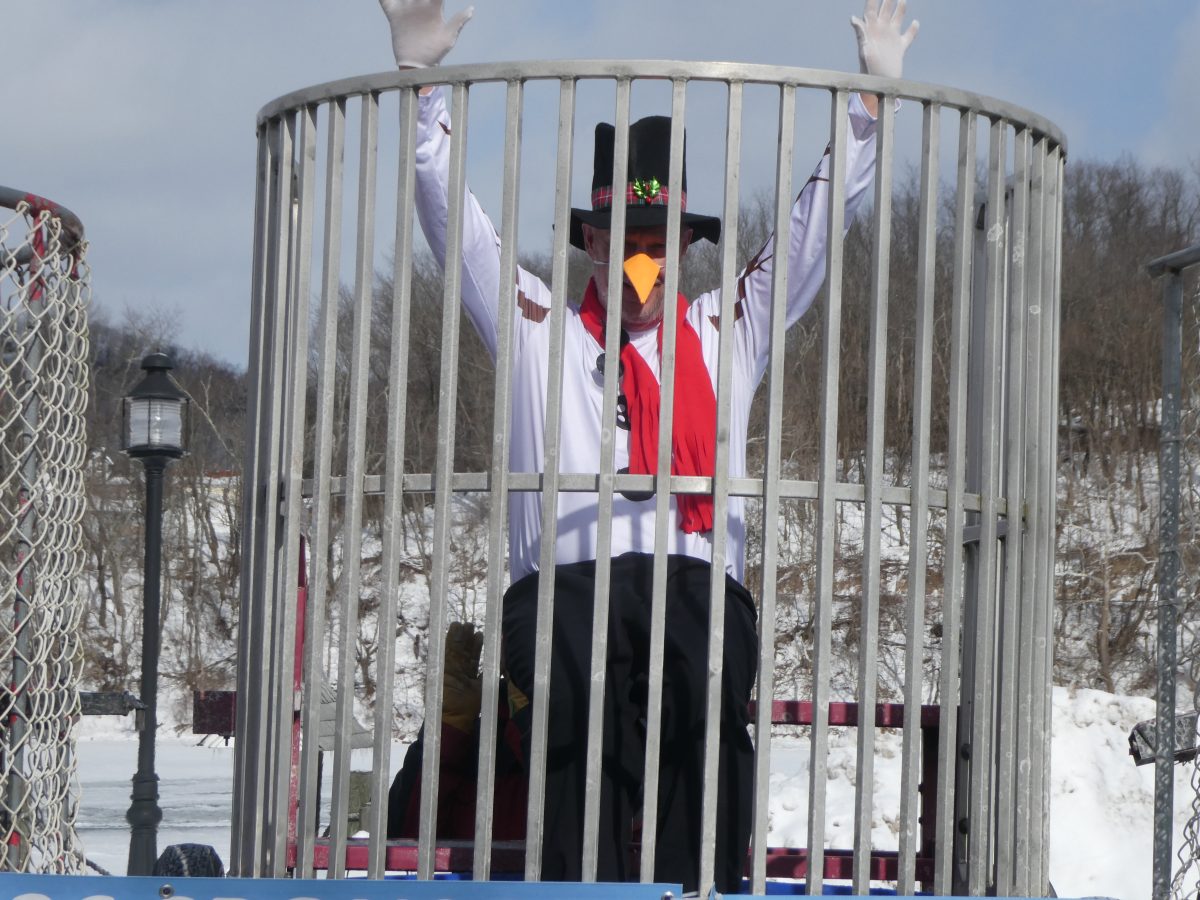 Walter MacFann, a California Area School District trustee who developed the idea for the Frosty Frolic, has gone into the water each year and did so again Saturday, dressed as Frosty the Snowman.
