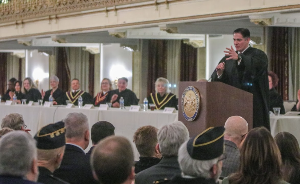 Newly installed state Superior Court Judge Brandon Neuman addresses the crowd while members of the Pennsylvania Supreme Court listen in the background during his induction ceremony Wednesday night at the Omni William Penn Hotel in Pittsburgh.