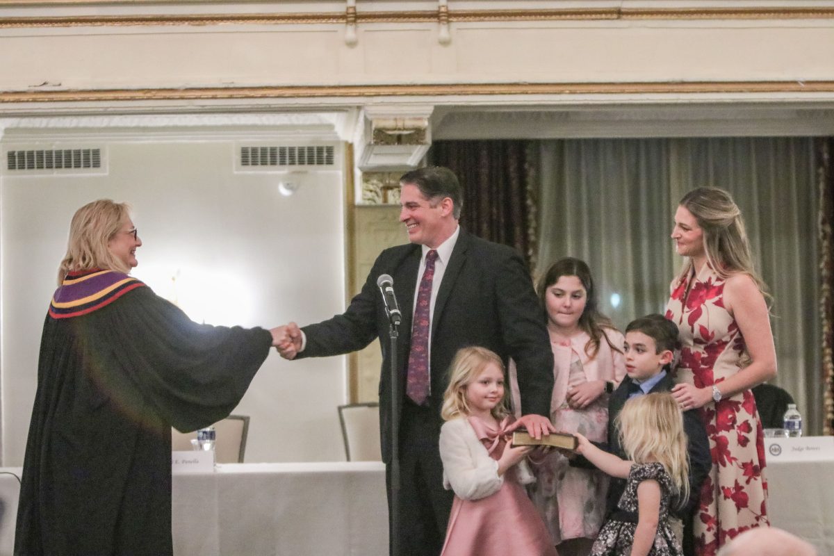 Pennsylvania Supreme Court Chief Justice Debra Todd shakes the hand of newly installed state Superior Court Judge Brandon Nueman after he was sworn-in Wednesday with his family by his side at the Omni William Penn Hotel in Pittsburgh.