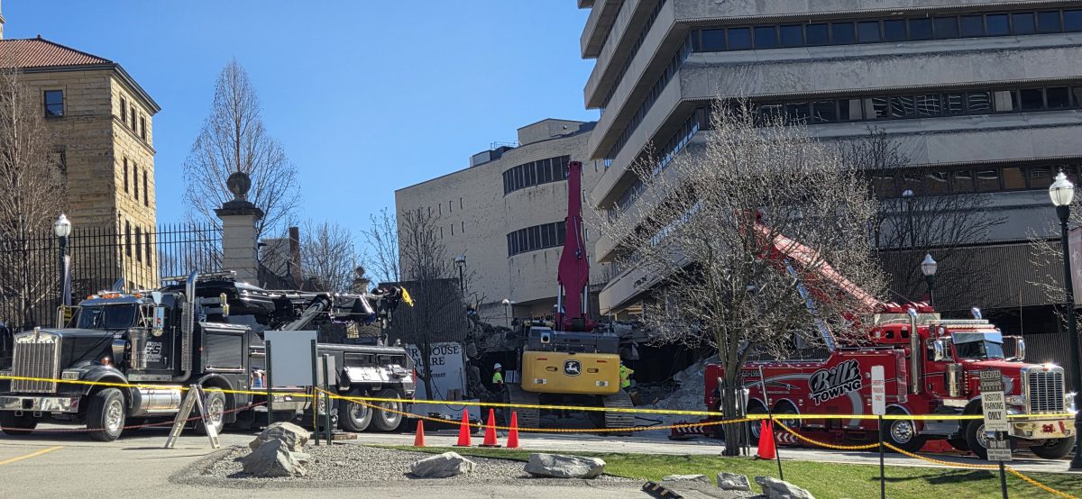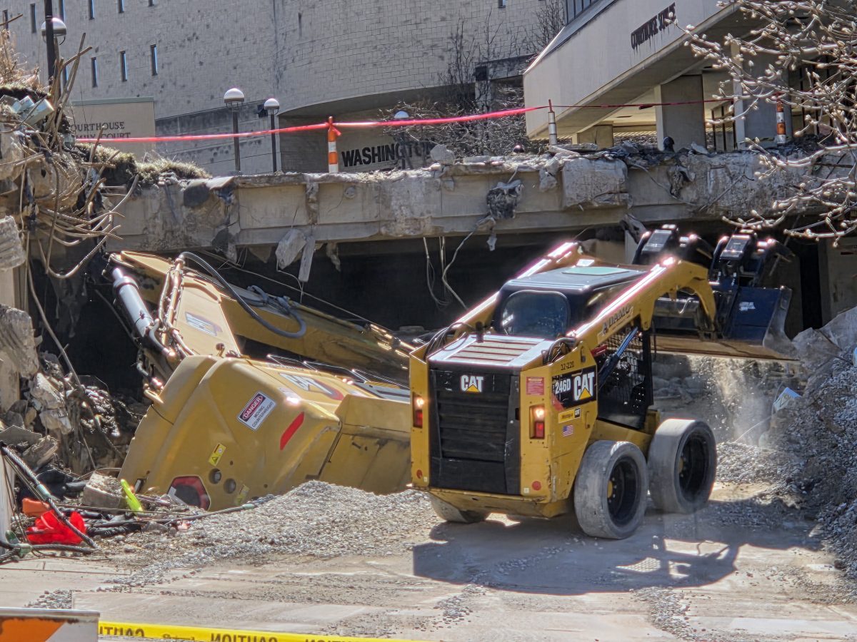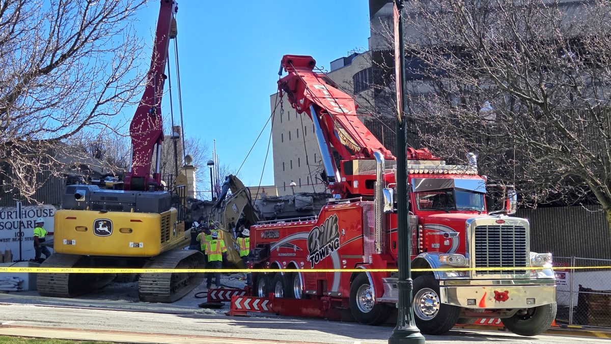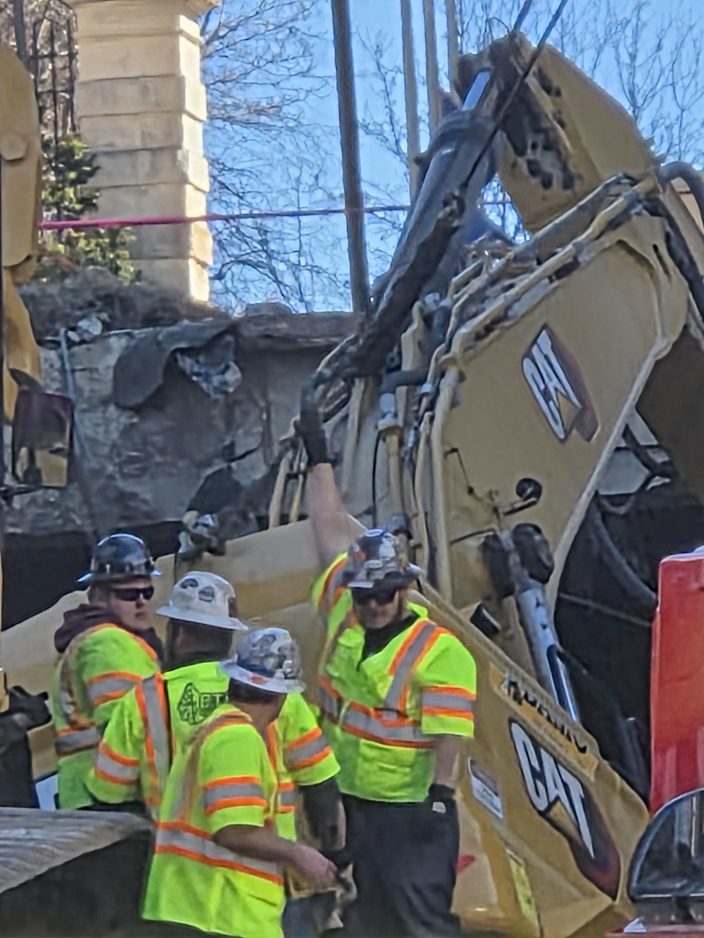 Creaking sounds could be heard as the crews flexed the wire pulleys and slowly but methodically raised the excavator up from its resting place, where it’s been since the March 3 accident after it apparently collapsed through a lower level near the entrance to the former parking garage. The operator was not injured in the incident and was able to get out of the vehicle on his own power, but the demolition work has been halted for a week and it’s uncertain when it will restart.