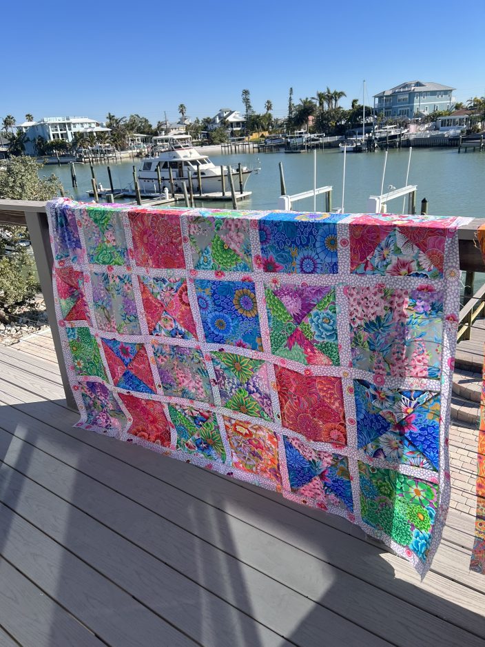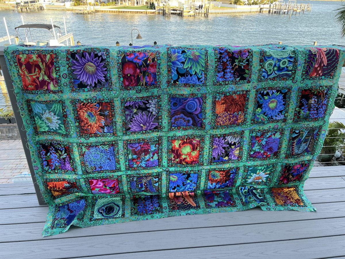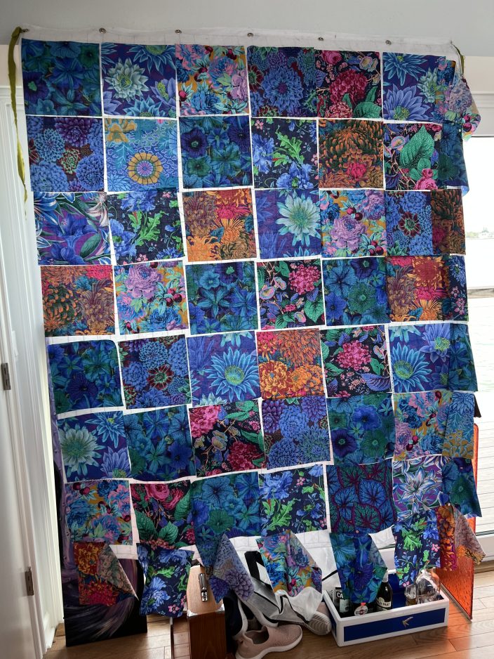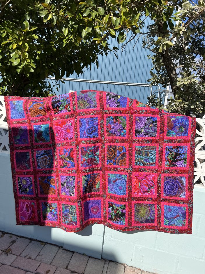Hopwood’s quilts – which are influenced by Kaffe Fassett, a titan and rock star in the world of quilting and decorative arts – are ablaze with purples, reds, blues, and other bright colors, and bold patterns.