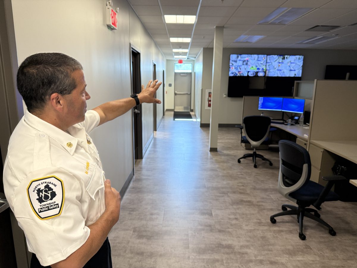 On the police side, the main room contains several desks and large monitors on the wall that display video feeds from traffic and surveillance cameras throughout North Strabane.