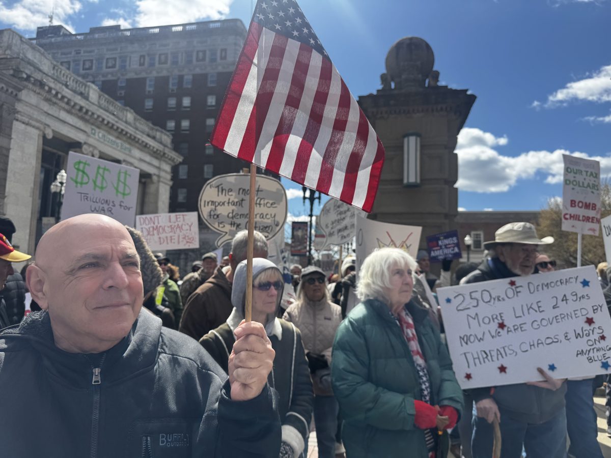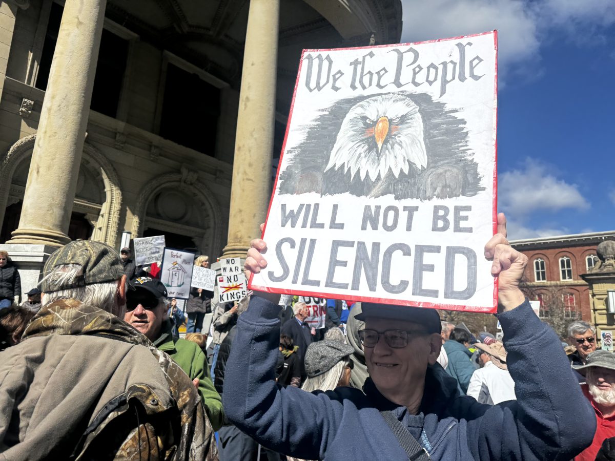 Under a sunny sky and chilly wind, hundreds of protesters lined the street in front of the Washington County Courthouse on Saturday afternoon, waving American flags and showing off their signs to passing cars, including messages like “Healthcare over warfare,” “Tariffs are taxes we pay,” “No War, No ICE” and “They blame immigrants so you don’t blame the billionaires.”