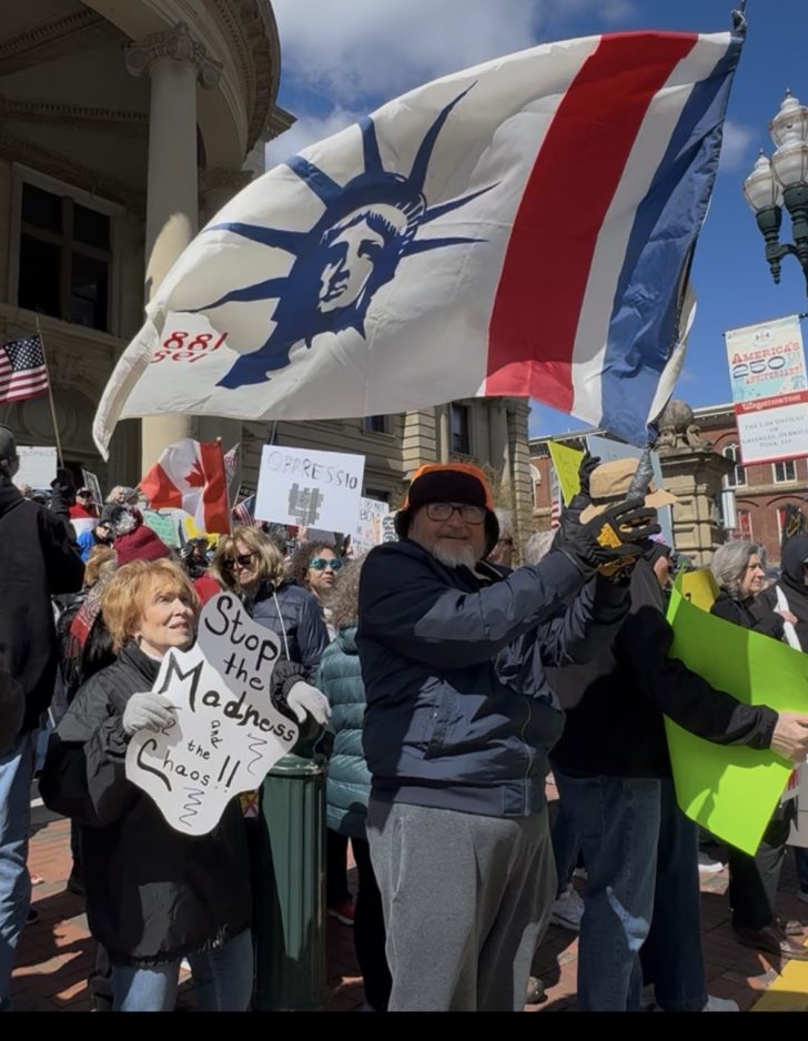 John Dusha, 73, of Clarksville, who briefly served as a clerk in the U.S. House of Documents Room in the U.S. Capitol after graduating from college, stood along Main Street waving a flag bearing the face of Lady Liberty, and described his disgust and disappointment about current leadership, calling it “criminal.”