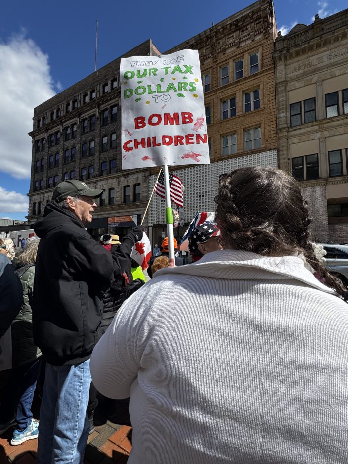 Stephanie Rodgers, a social worker from Washington County, carried a sign that read, “They use our tax dollars to bomb children.”