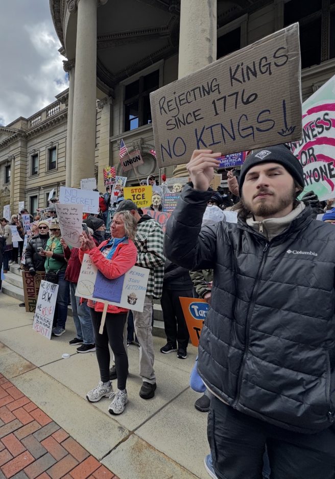 Cameron Boley, 23, a materials scientist for Alcoa Corp., held a cardboard sign that read, “Rejecting kings since 1776.”