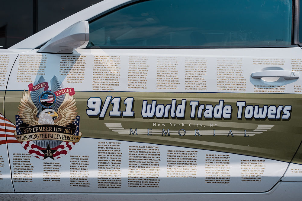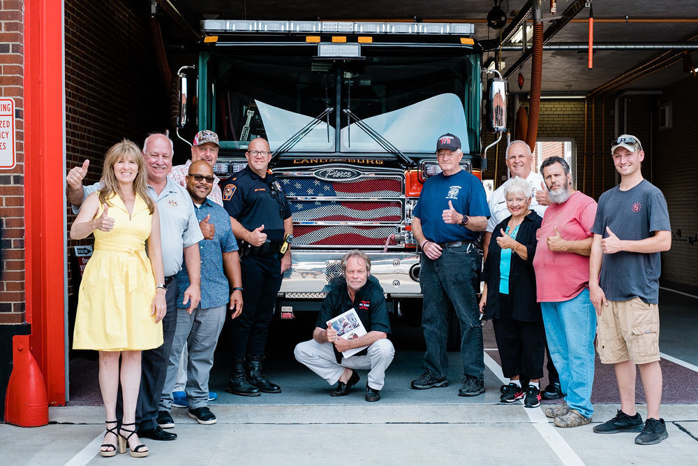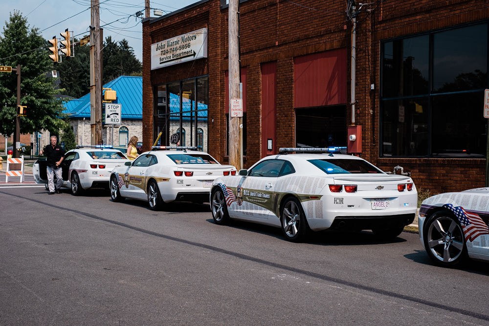 Kevyn Major Howard, center, and his wife Tiffany, far left, pose with a small group of Canonsburg firefighters, police officers and borough council members Monday afternoon as part of his foundation Fueled by the Fallen’s cross-country trip in Chevy Camaros bearing the names of all lives lost on 9/11. The tour, dubbed the “Angel Tribute Cars Crossing America Tour,” is being turned into a documentary by filmmaker Steven Barber.