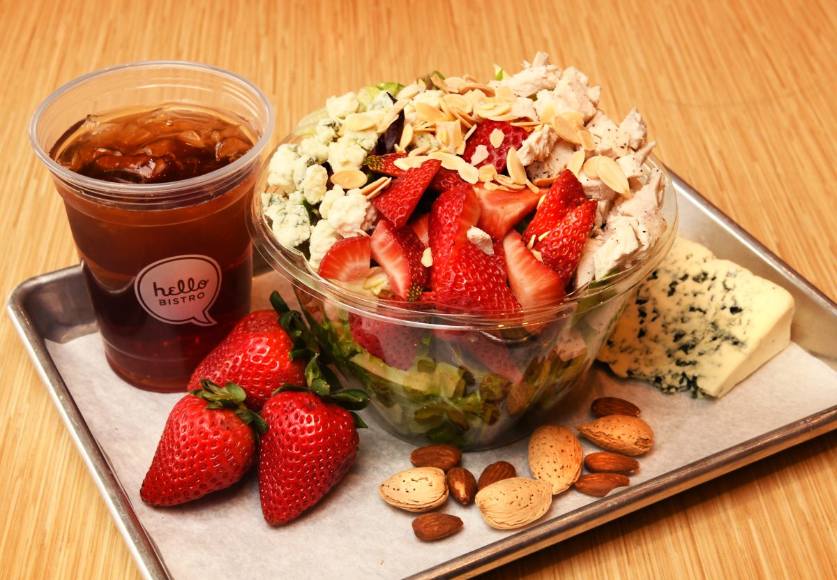 2. Top the greens with chicken breast, strawberries and crumbled bleu cheese.