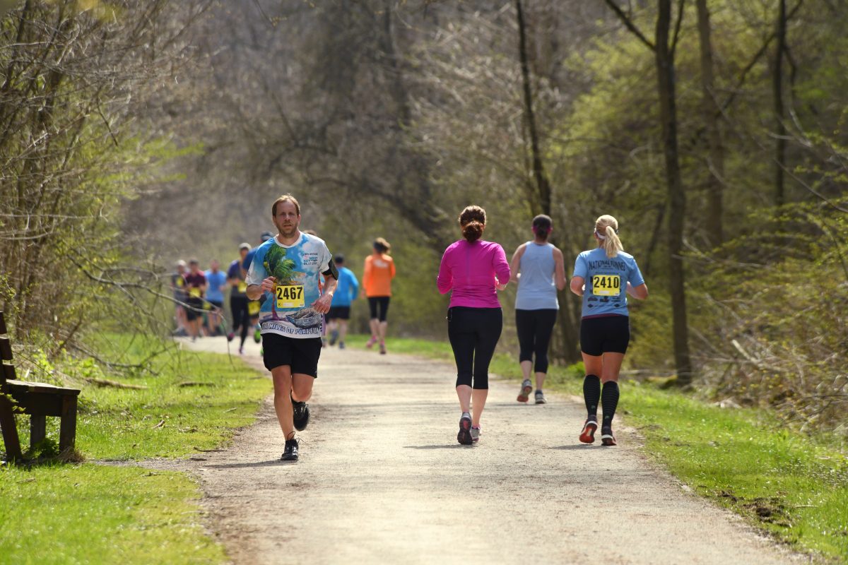 Runners in the 10K race on April 22 pass each other on the Montour Trail in Cecil. The race began and ended at the access path in Cecil Township Park, taking runners through the national tunnel on the trail.