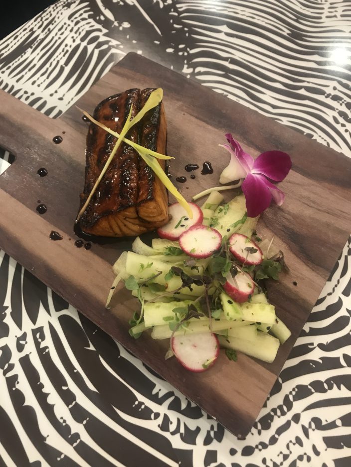 7. Heat oil in hot sauté pan and sear salmon on glaze side for 1-minute on high heat.