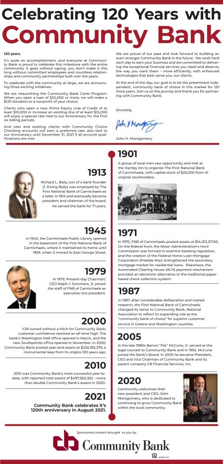 /Community_Bank Celebrating 120 Years with Community Bank Aug 11, 2021 1 min read 2021-08 Community Bank Timeline (1).jpg Sponsored content brought to you by Community Bank.