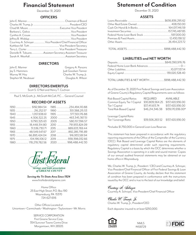 WAYNESBURG, PA – During its annual meeting of members Jan. 27, First Federal Savings and Loan Association of Greene County announced it had ended 2020 with record year-end assets of $998.5 million.