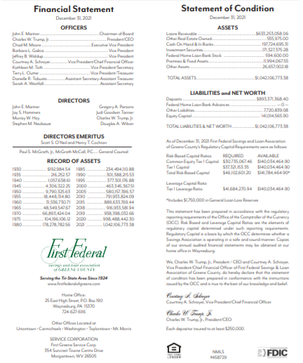 “We are excited and proud of our success and growth, and acknowledge that many people and much effort went into reaching this momentous asset threshold,” said Charles W. Trump, Jr., President/CEO of First Federal of Greene County.