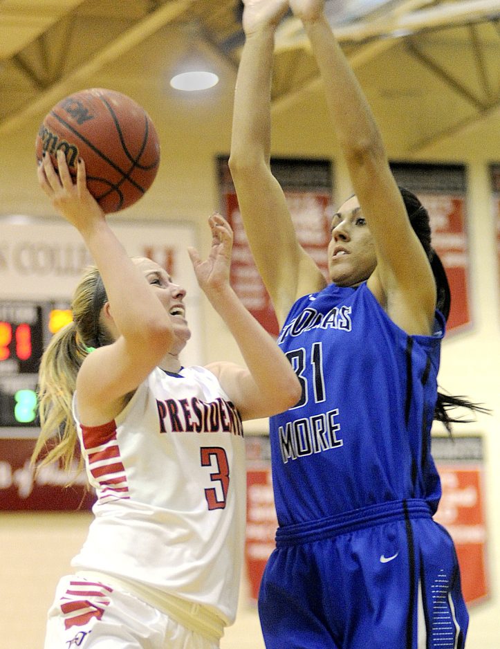 But what put W&J in a hole was Thomas More’s full-court press, led by Moss and fifth-year senior guard Katie Kitchen, that forced 14 first-half turnovers and made the Presidents play at a faster tempo than they could comfortably live with.