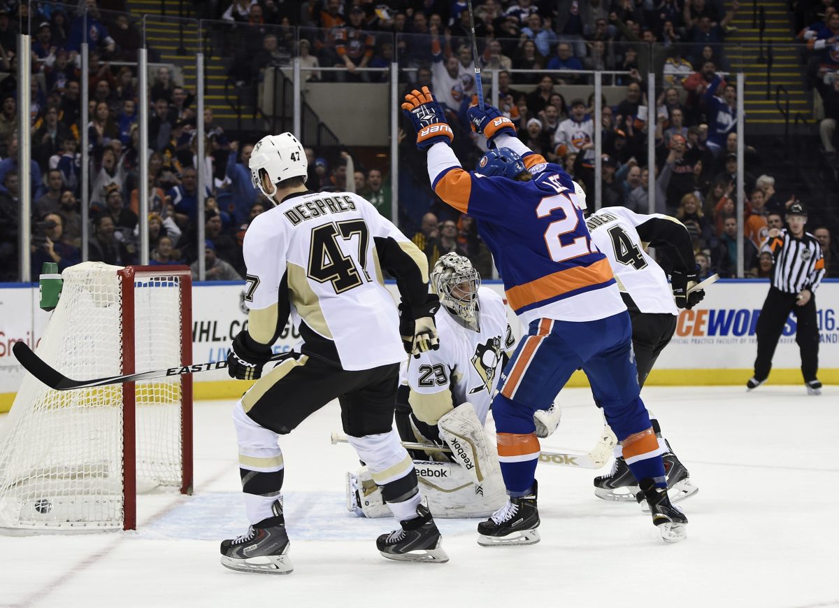 New York’s second power play failed to produce a goal, but the Islanders cut the deficit in half just seconds after the advantage. Tavares drove down the left side of the Penguins zone, made a slick move to get around defenseman Simon Despres, and slid a pass across the crease to Okposo, who guided the puck in with his skate with 3:09 left.