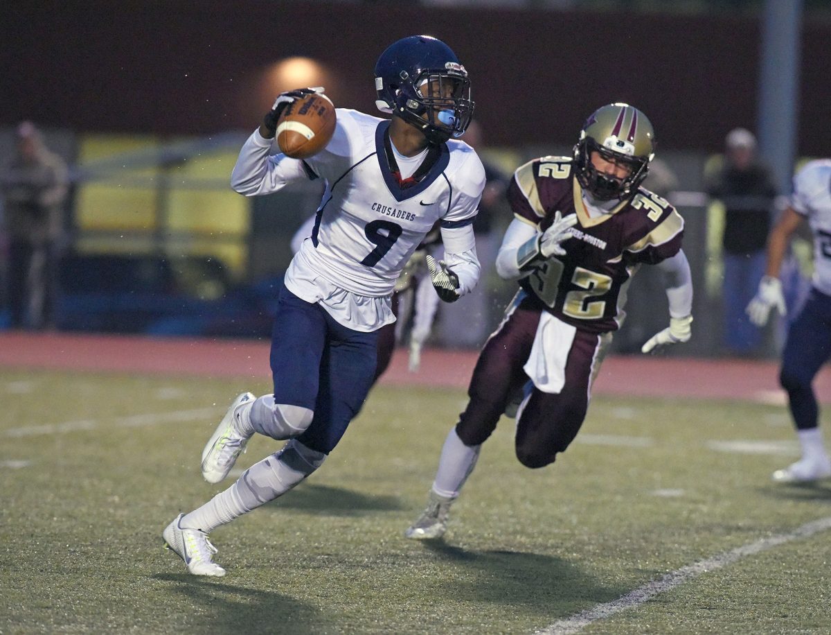 Scott accounted for four touchdowns for the Crusaders, rushing for two and throwing for two. Sean Fitzgerald caught four passes for 101 yards, including an 80-yard touchdown. Amaan Bridgett rushed for 89 yards on 18 carries, though 36 came on one play.