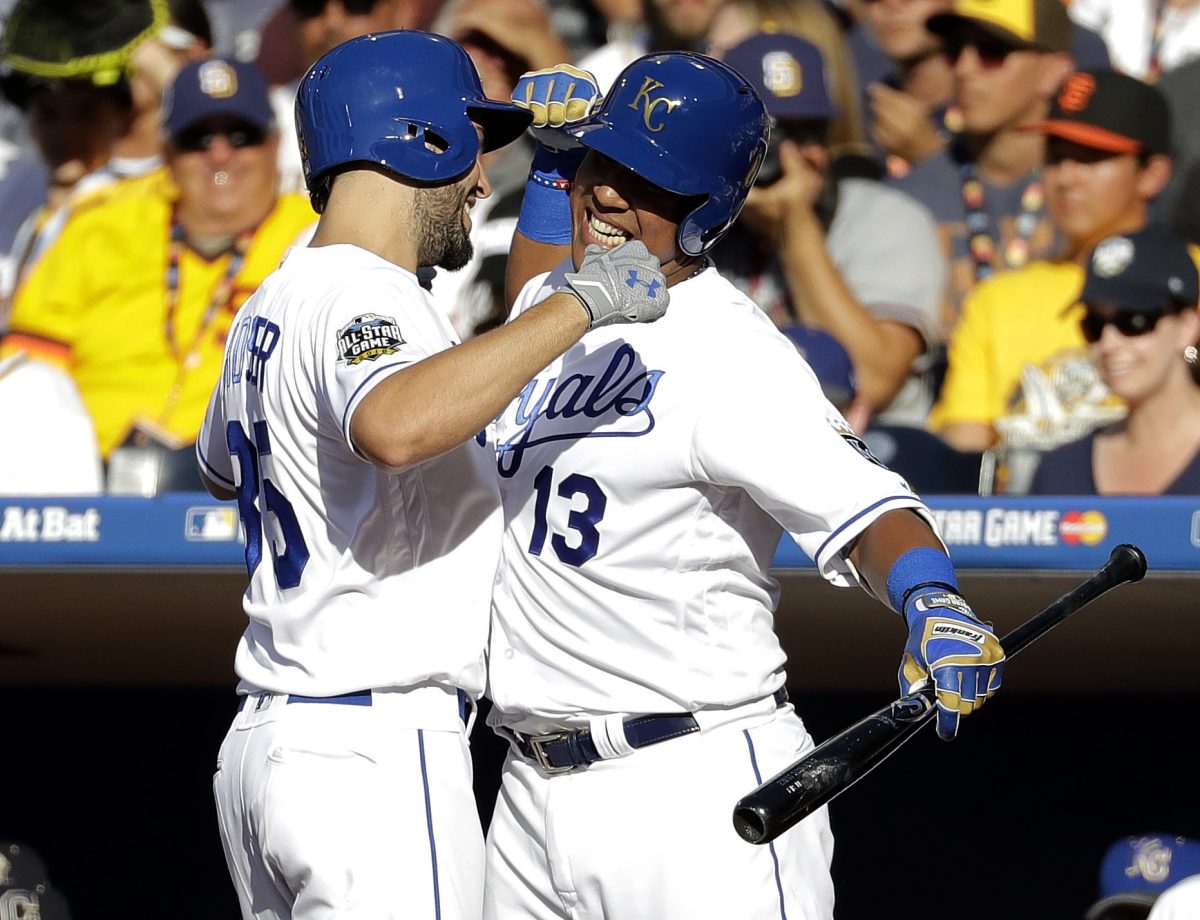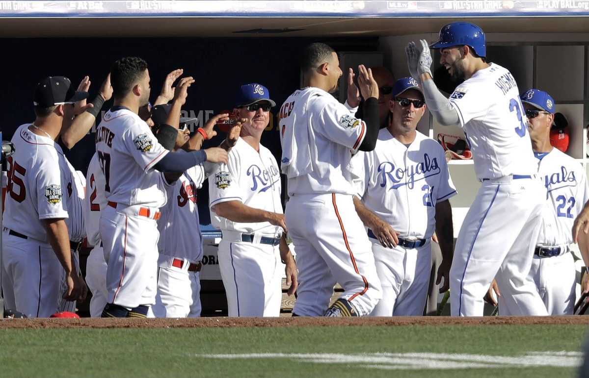 American League’s Eric Hosmer, of the Kansas City Royals, left, greets teammate Salvador Perez, of the Kansas City Royals, after hitting a solo home run against the National League during the second inning of the MLB baseball All-Star Game, Tuesday, July 12, 2016, in San Diego. (AP Photo/Gregory Bull)