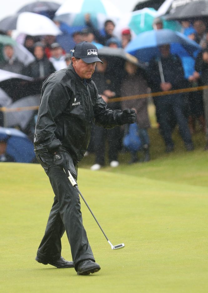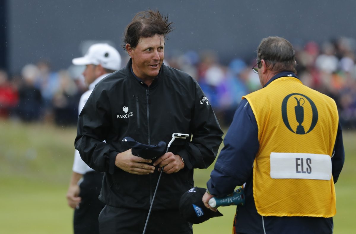 TROON, Scotland – Phil Mickelson has nearly everything going his way at this British Open. He has control of his shots and the flight of his ball in the wind and rain. He has the lowest 36-hole total at Royal Troon. He even caught a break with the weather, his black rain suit coming in handy only over his final 10 holes Friday.