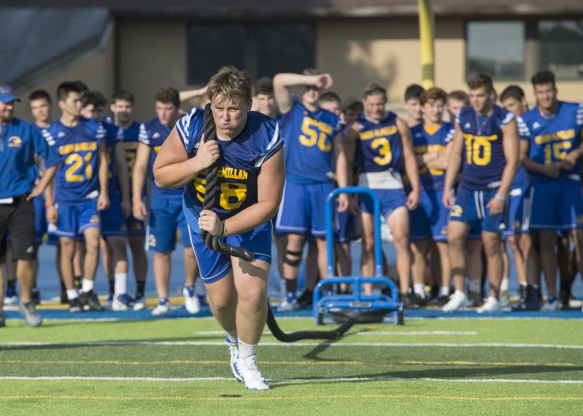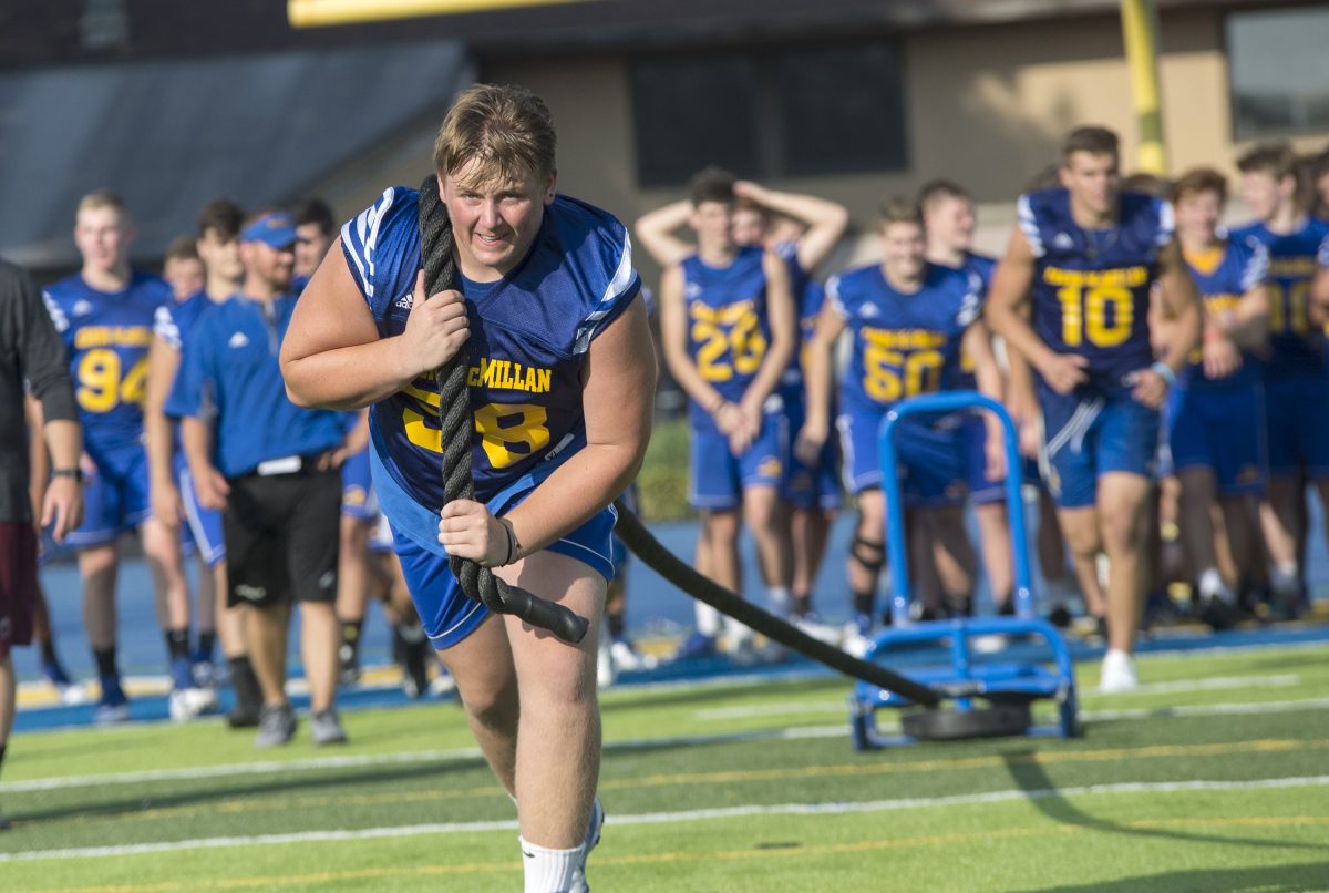 Riley Noble pulls a sled with weights during foot practice at Canon-Mac