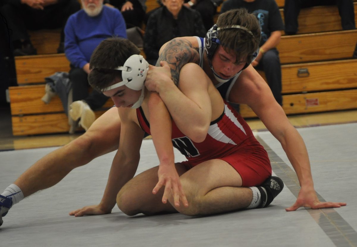 Trinity’s points came from three forfeits. One of them went to Cole Whitmer for his 100th career victory. The match was stopped and Trinity head coach Mark Powell presented him a small trophy.