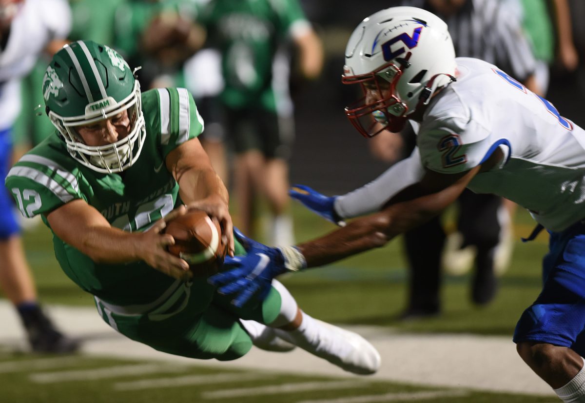 South Fayette quarterback Landon Lutz (12) leaps into the end zone for a score. His 10-yard TD run lifted South Fayette to 28-14 lead in the fourth quarter of a non-conference contest Friday night against Chartiers Valley.