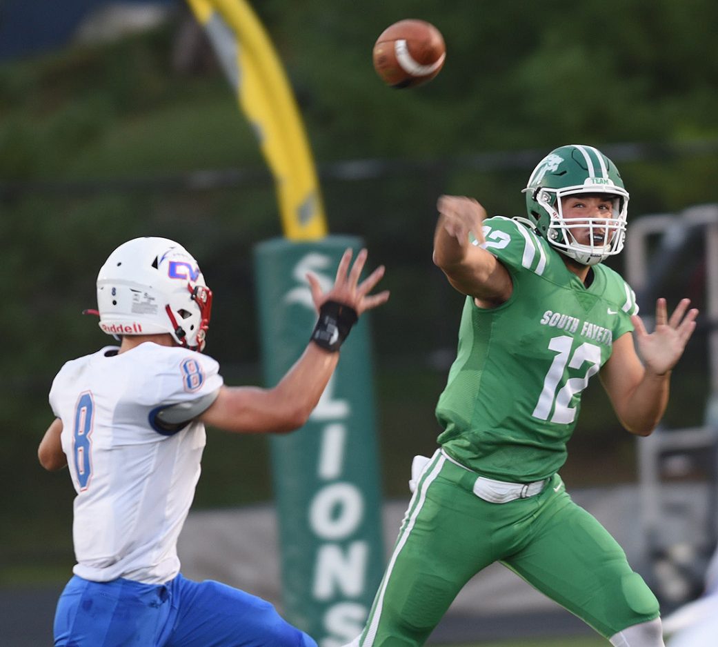 South Fayette quarterback Landon Lutz (12) unloads a pass over Chartiers Valley defender Tyler Glover (8) during non-conference football action.