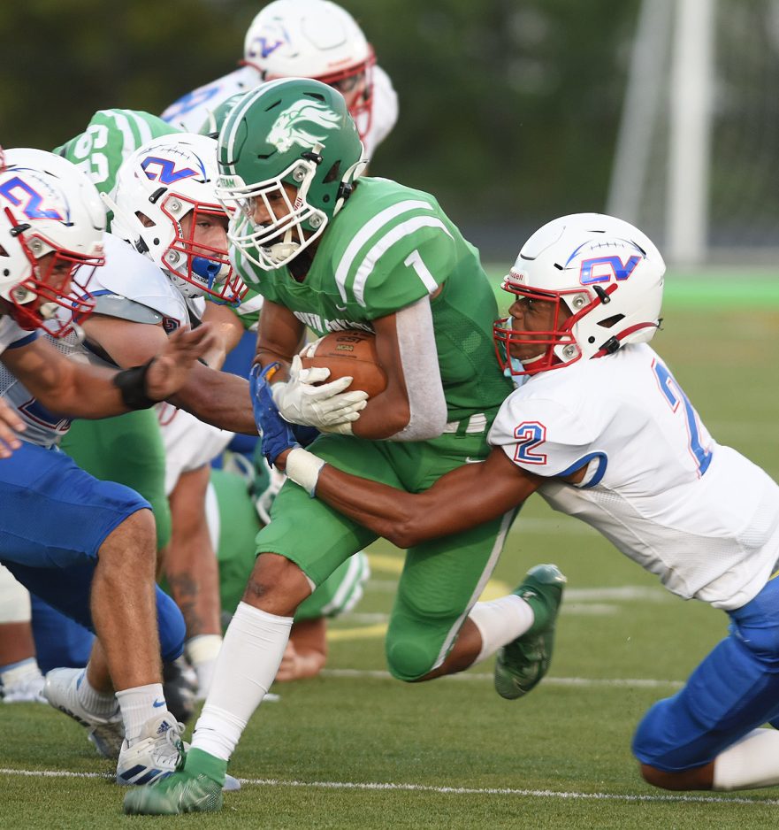 A swam of Chartiers Valley defenders are needed to bring down South Fayette tailback Nate Deanes (1) during the first half of a non-conference game Friday night.