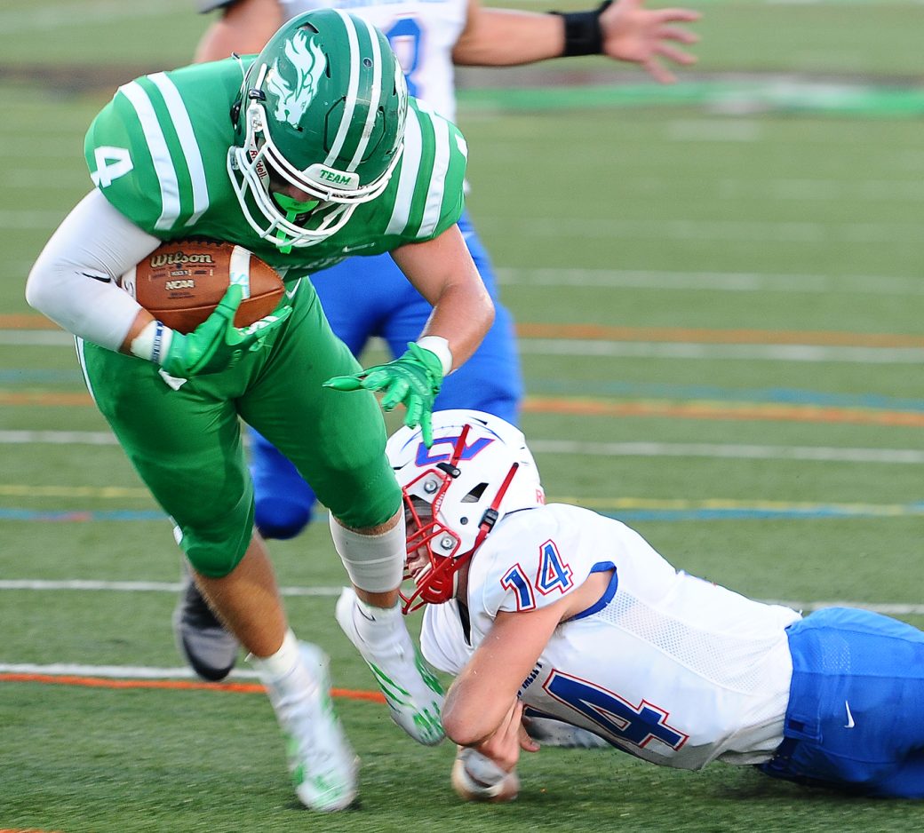 South Fayette’s Connor Harcarik escapes the grasp of Chartiers Valley’s Anthony Mackey to score the first touchdown of the game.