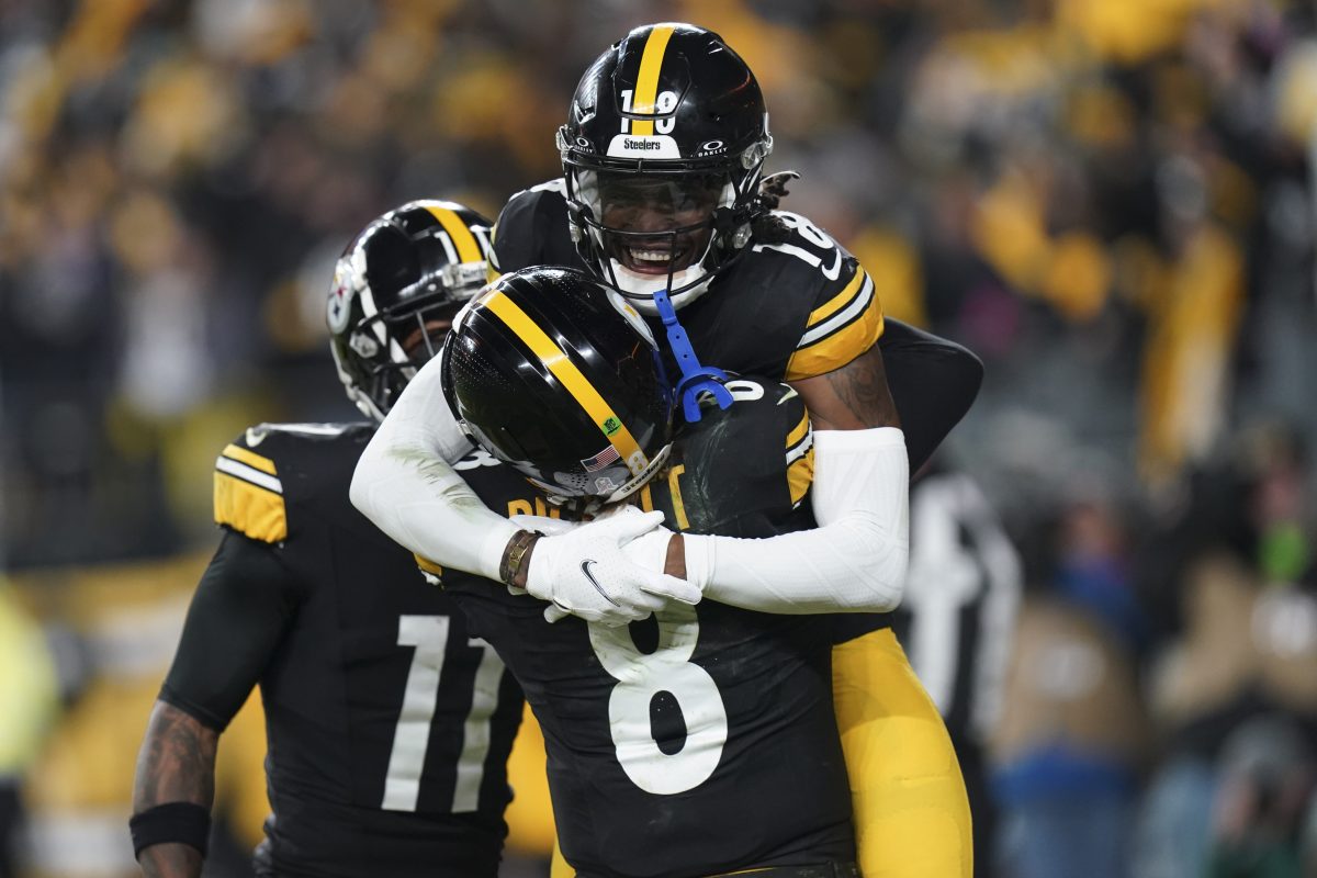 Pittsburgh Steelers wide receiver Diontae Johnson (18) and quarterback Kenny Pickett (8) celebrate a touchdown against the Tennessee Titans during the second half of an NFL football game Thursday, Nov. 2, 2023, in Pittsburgh.