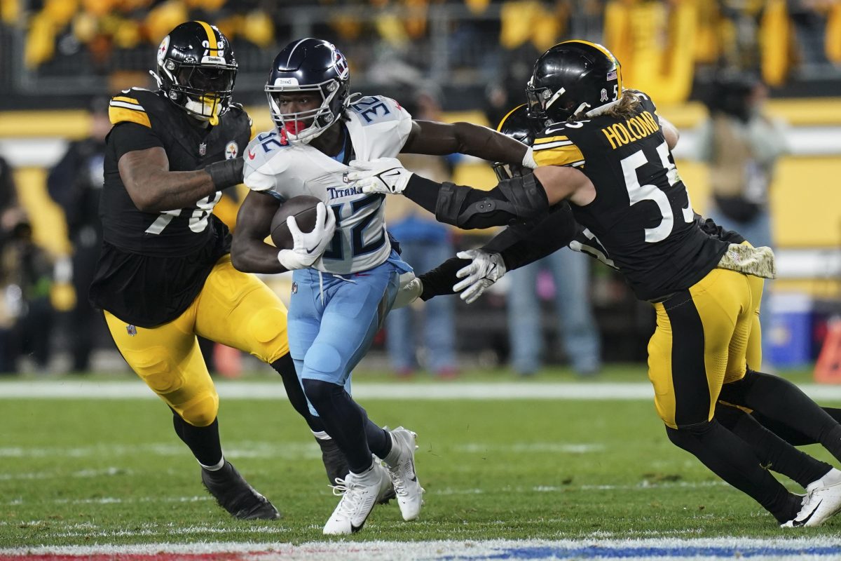Tennessee Titans running back Tyjae Spears, center, runs the ball past Pittsburgh Steelers defensive end DeMarvin Leal, left and linebacker Cole Holcomb, right, during the first half of an NFL football game Thursday, Nov. 2, 2023, in Pittsburgh.