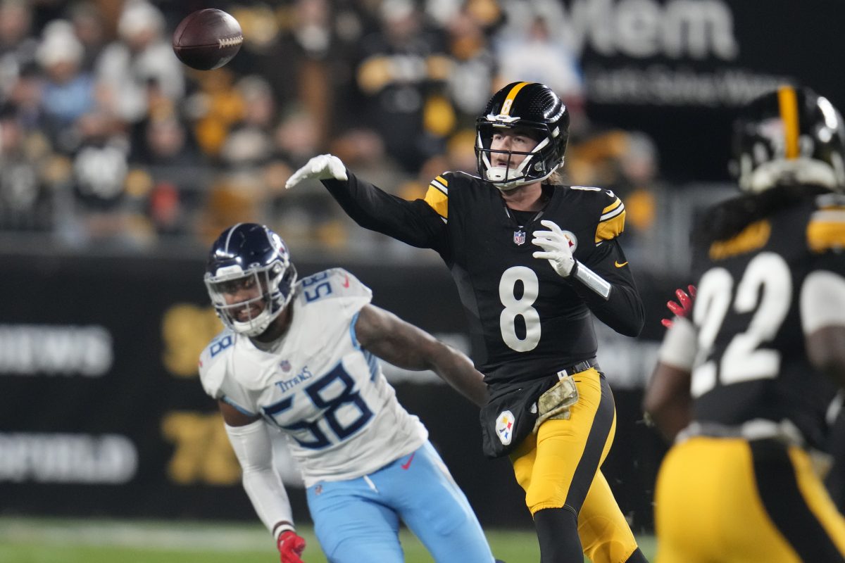 Pittsburgh Steelers quarterback Kenny Pickett (8) throws pass against the Tennessee Titans during the first half of an NFL football game Thursday, Nov. 2, 2023, in Pittsburgh.
