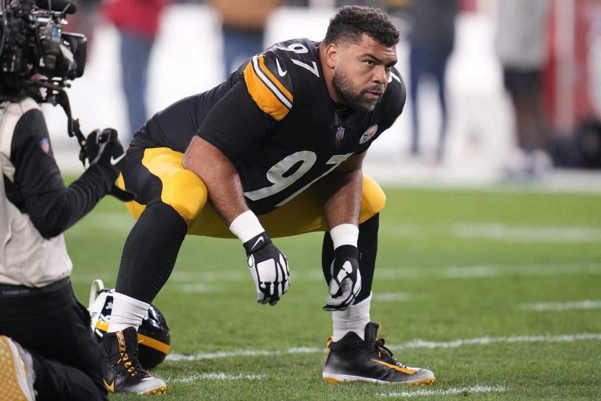 Pittsburgh Steelers defensive tackle Cameron Heyward (97) warms up before an NFL football game against the Tennessee Titans, Thursday, Nov. 2, 2023, in Pittsburgh.