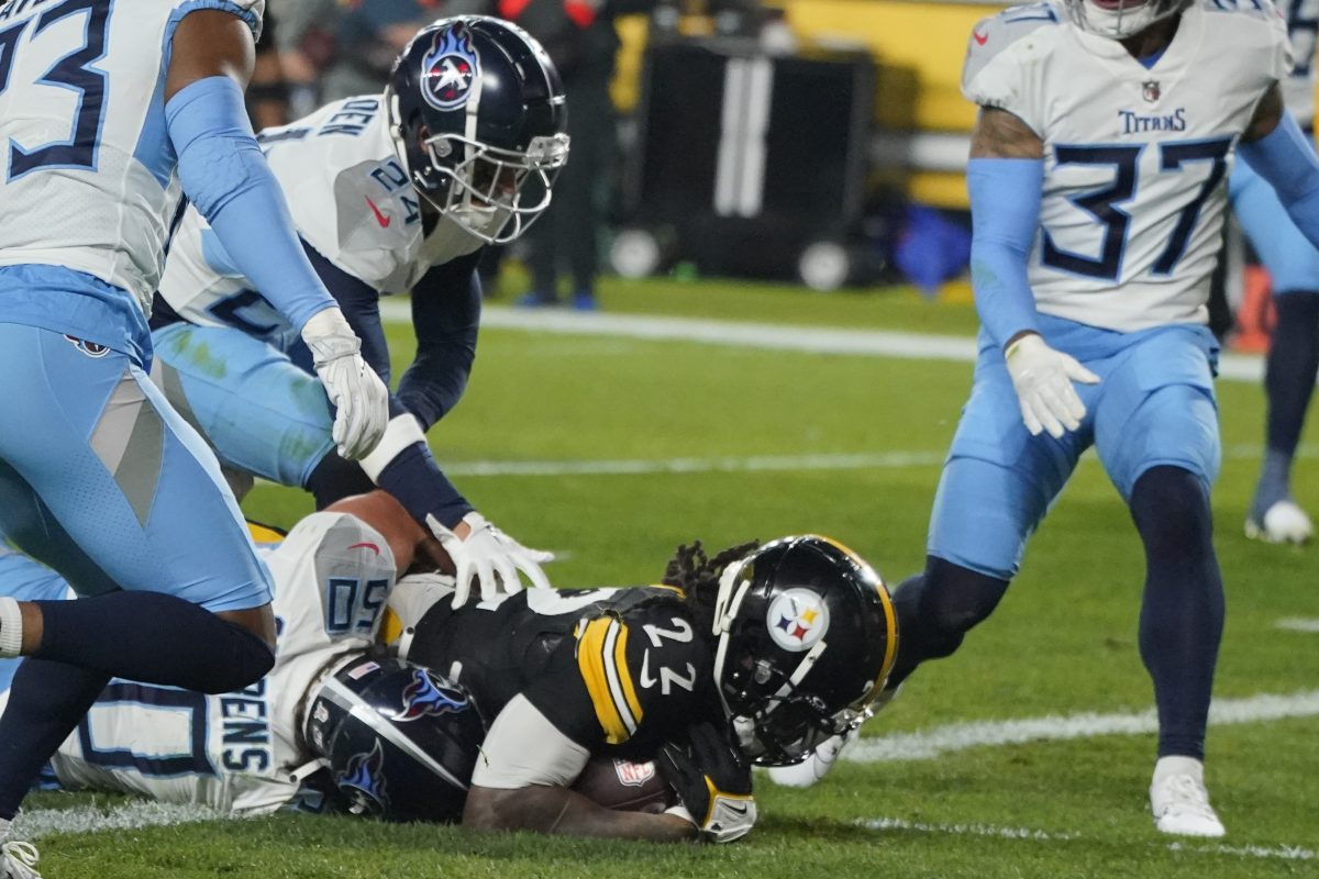 Pittsburgh Steelers running back Najee Harris (22) scores a touchdown past Tennessee Titans linebacker Jack Gibbens (50) and defensive back Elijah Molden (24) during the first half of an NFL football game Thursday, Nov. 2, 2023, in Pittsburgh.