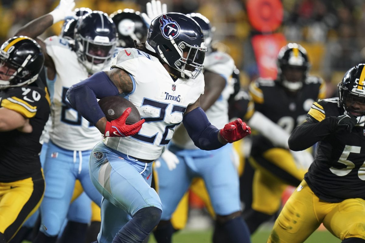 Tennessee Titans running back Derrick Henry (22) runs the ball against the Pittsburgh Steelers during the first half of an NFL football game Thursday, Nov. 2, 2023, in Pittsburgh.