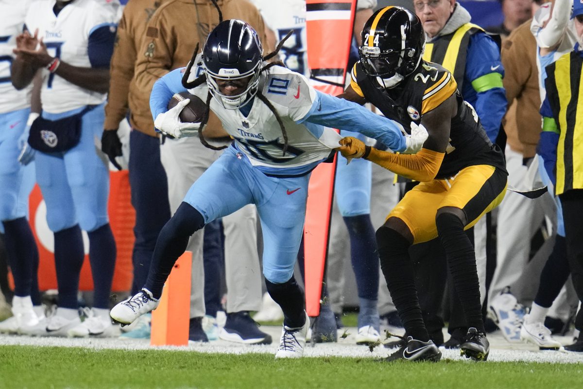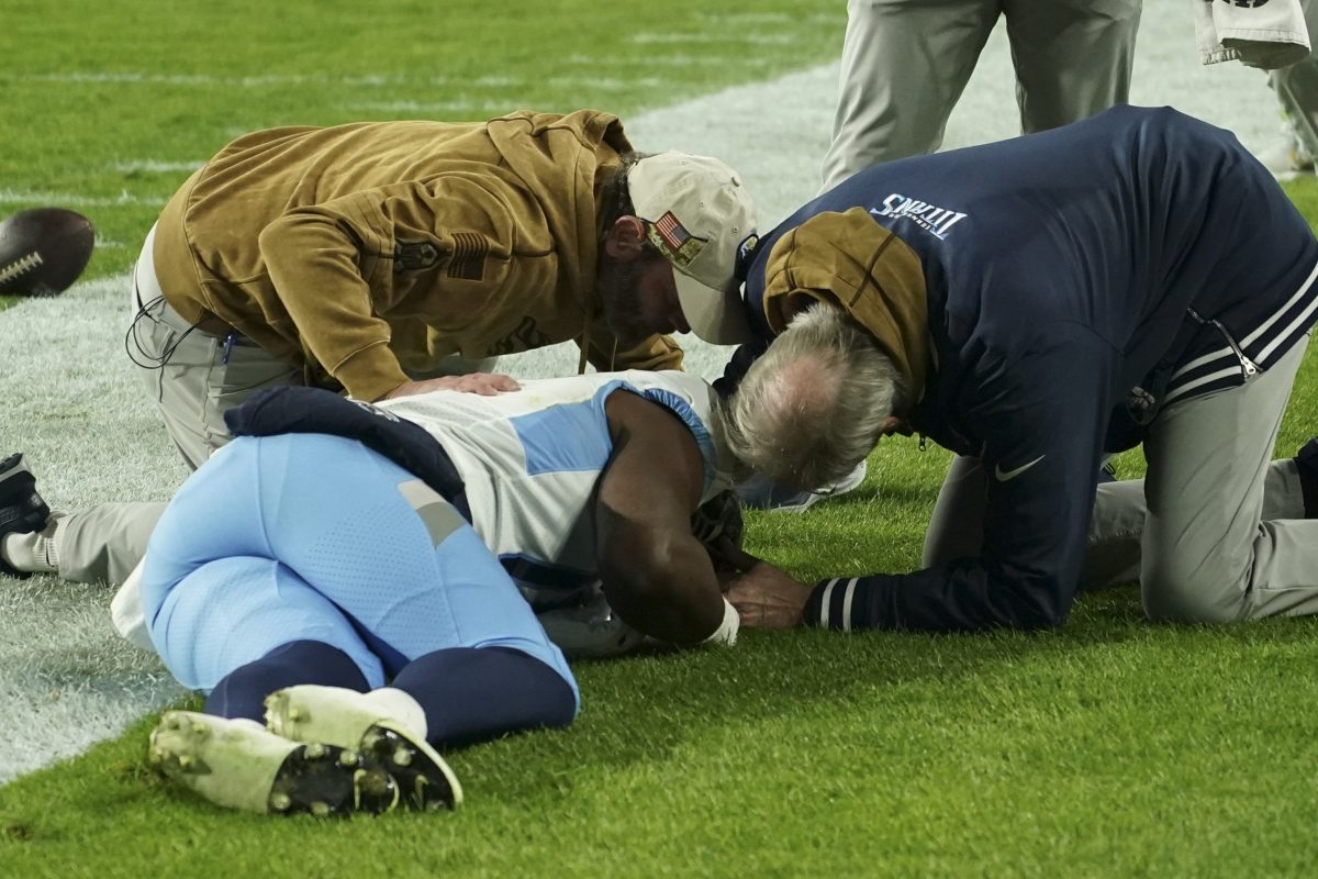 Titans wide receiver Treylon Burks was carted off the field with just over 2 minutes to go when he landed hard on the Acrisure Stadium turf after unsuccessfully trying to haul in a fourth-down heave from Levis. The second-year pro lay on the Acrisure Stadium turf for several minutes while being tended to by medical staff from both teams. He was carted off the field but did have movement in all four extremities. The Titans said Burks had full movement in all his extremities, it was reported on the Amazon TV broadcast.