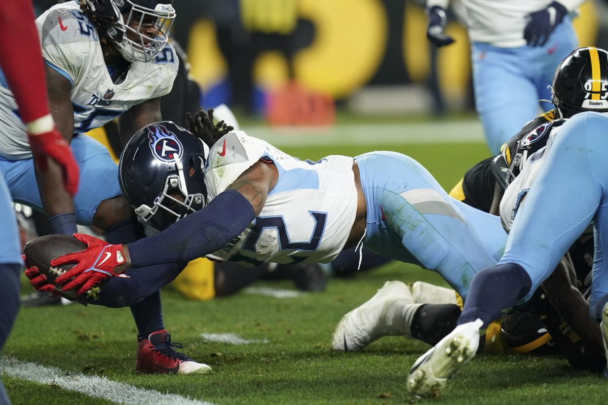 Tennessee Titans running back Derrick Henry (22) dives into the end zone for a touchdown against the Pittsburgh Steelers during the first half of an NFL football game Thursday, Nov. 2, 2023, in Pittsburgh.
