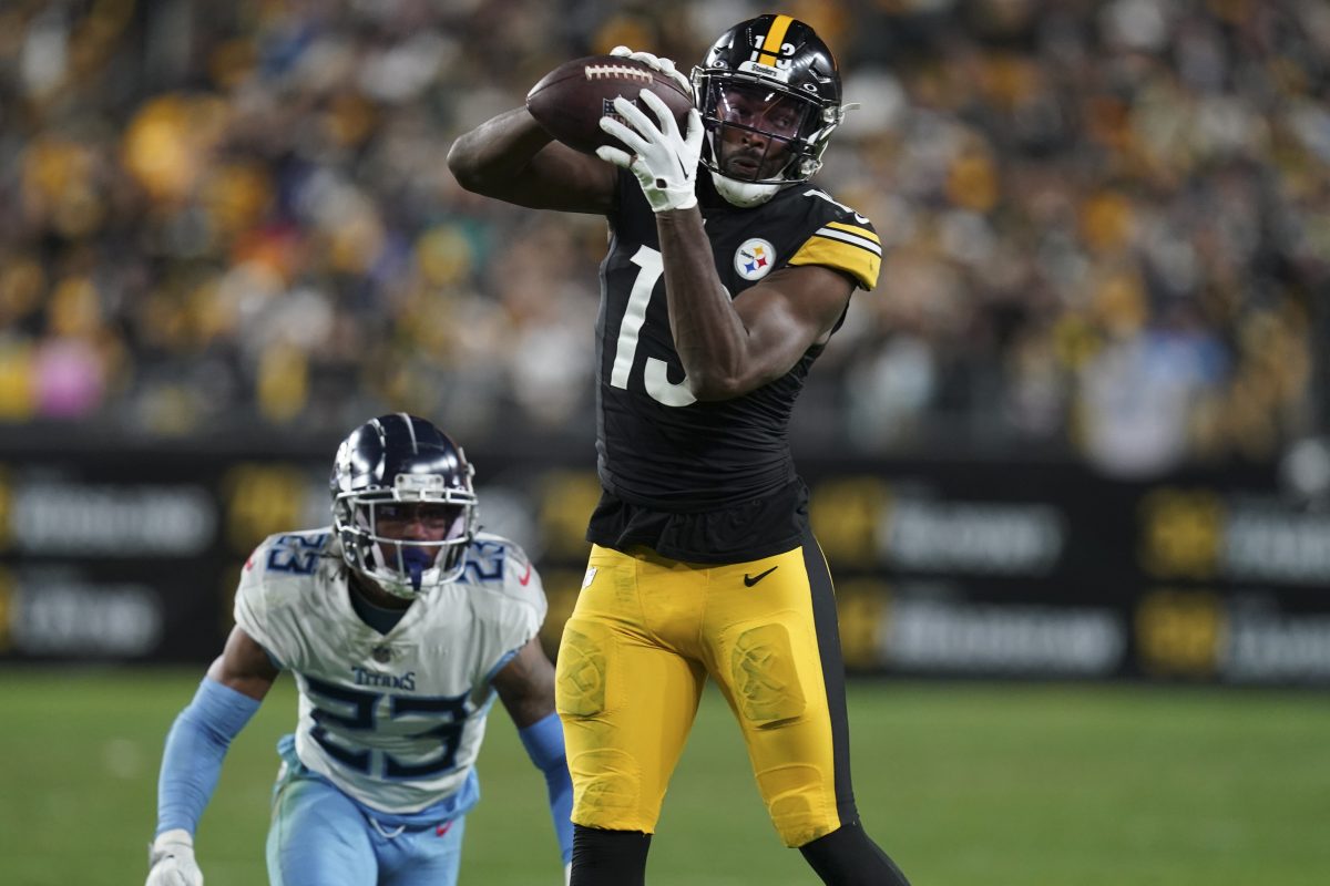 Pittsburgh Steelers wide receiver Diontae Johnson, right, makes a catch over Tennessee Titans safety Terrell Edmunds (38) during the first half of an NFL football game Thursday, Nov. 2, 2023, in Pittsburgh.