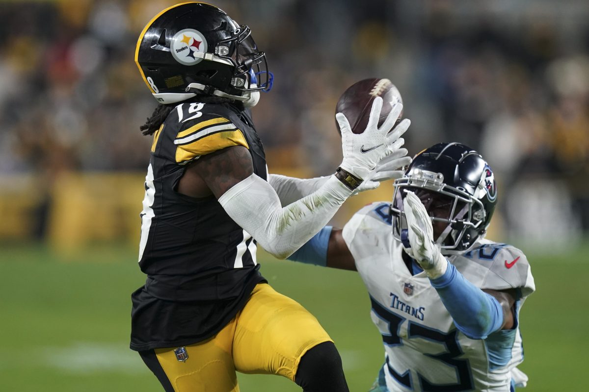 Pittsburgh Steelers wide receiver Diontae Johnson (18) makes a catch past Tennessee Titans cornerback Tre Avery (23) during the second half of an NFL football game Thursday, Nov. 2, 2023, in Pittsburgh.