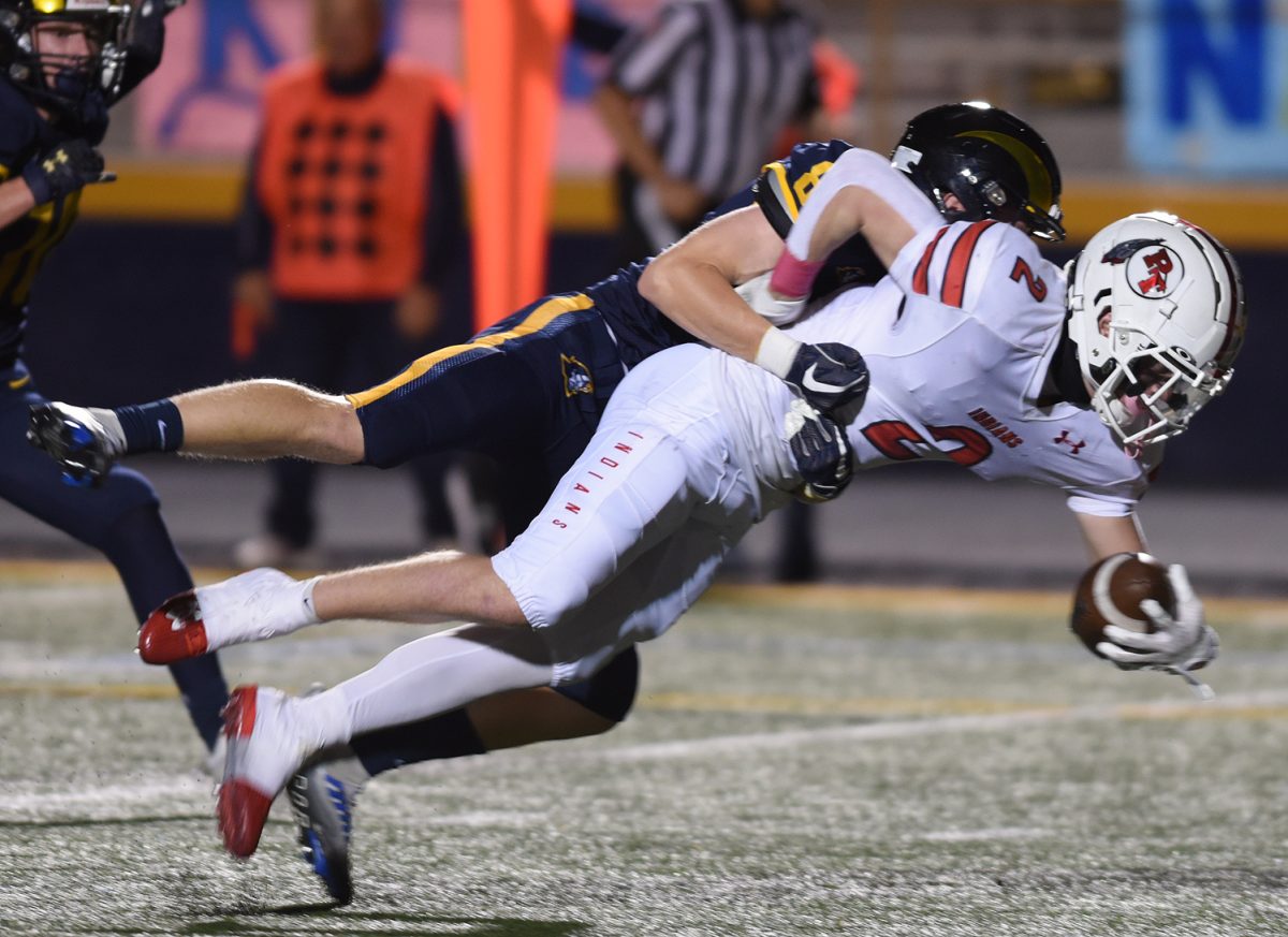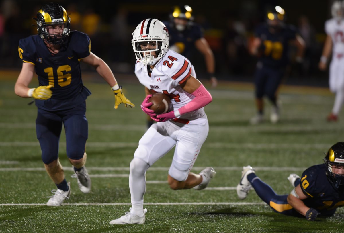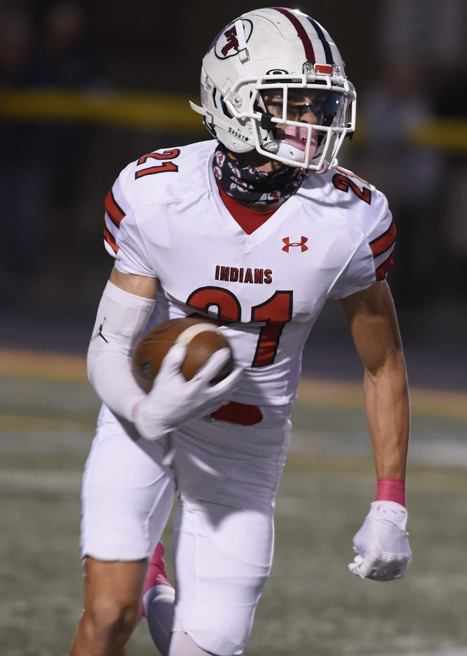 Reston Lehman put some points on the scoreboard for the defense when he intercepted a Hyland pass towards the end of the first half and returned it 39 yards for a touchdown to push the Indians lead to 35-0 at halftime.