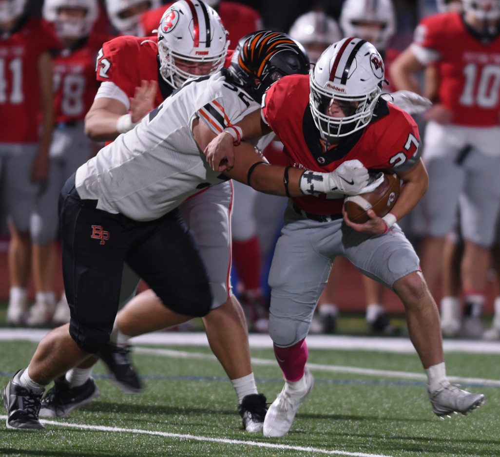 Bethel Park (3-2, 8-2) began the second half the same as they ended the first, with a touchdown. This one was a 50 yard Ja Vaughn Moore (20 carries, 118 yards) burst up the middle on the sixth play of the third quarter. Jackson Friday knocked home the extra point, knotting the score at 21 early in the third.