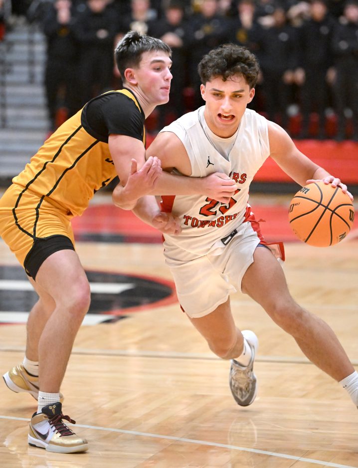 Jayden Greco responded with a three-pointer, his first basket of the game, at the minute mark to put Peters Township in front 38-36.