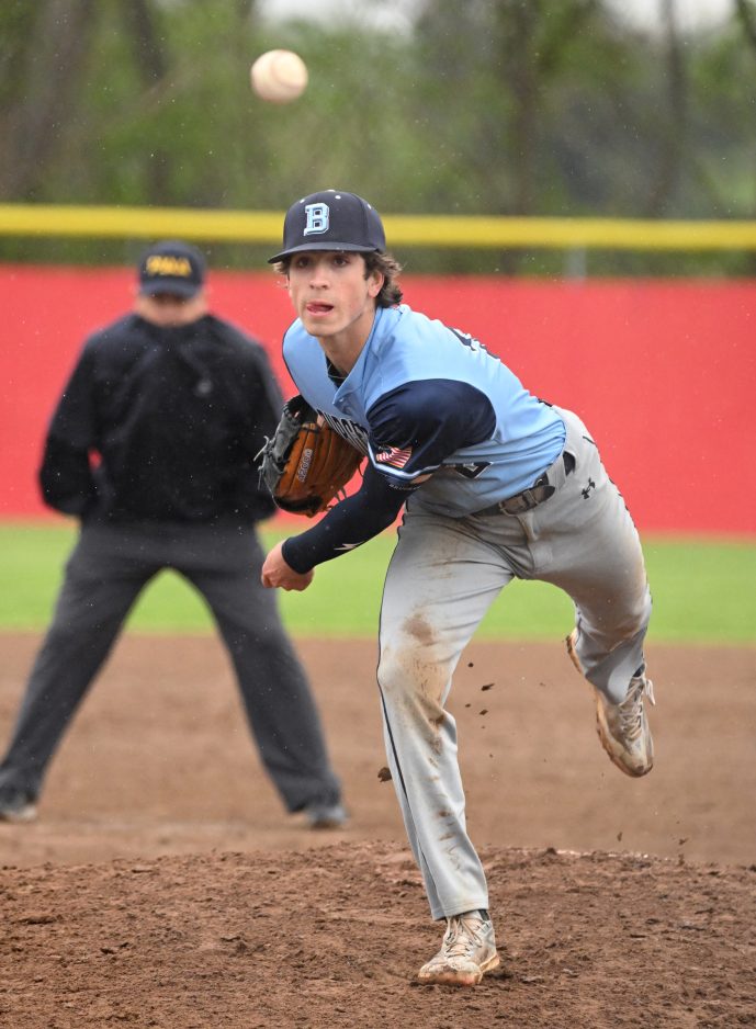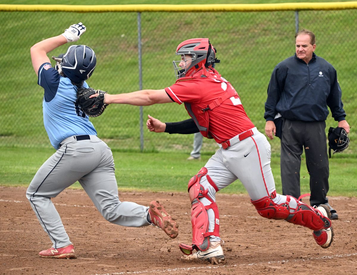 But with the Blue Devils clinging to a 12-11 lead in the bottom of the seventh, runners on second and third and one of Fort Cherry’s stars, Matt Sieg, at the plate, Burgettstown’s Jayden Roach — who pitched 2.1 innings in relief — struck out Sieg, who hit the ground with his bat in frustration.