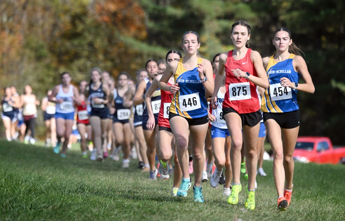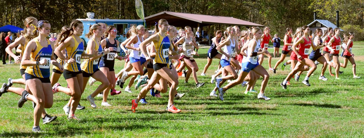 Girls from across Washington County take off from the start of the County Coaches cross country meet at Mingo Park on October 14.