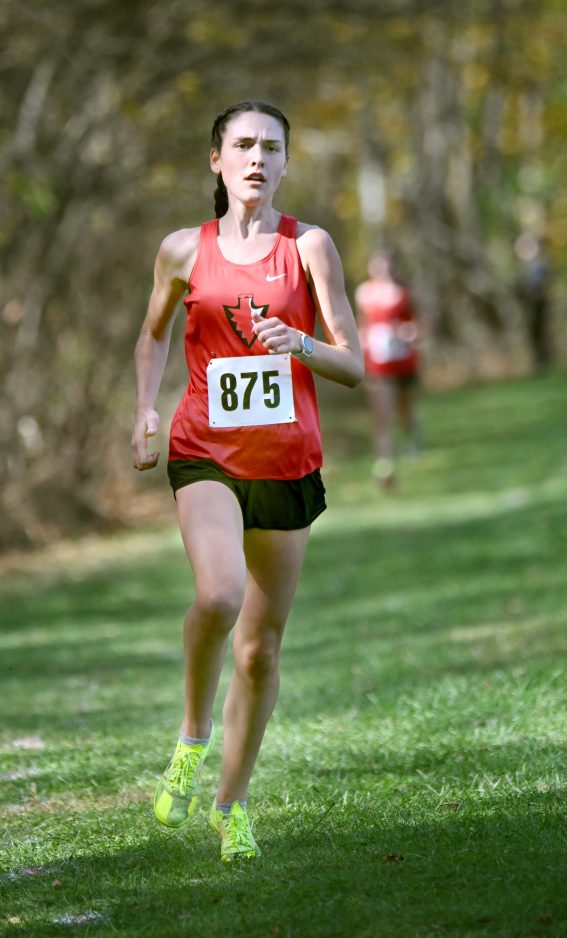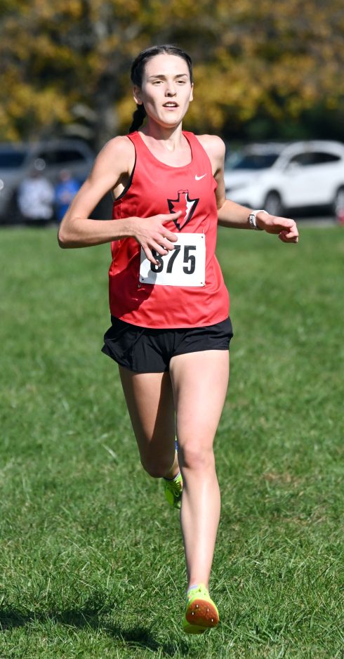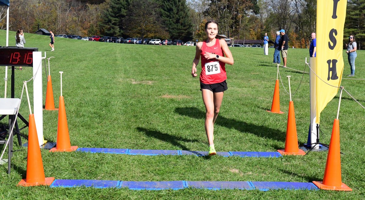 Peters Township senior Adelaide Lulich finisies the final yards of the October 14 Washington County coaches cross country meet, winning the race with a time of 19'17". This was Lulich's first season running cross country.