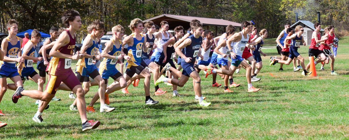Boys from across Washington Country take off from the start of the County Coaches cross country meet at Mingo Park on October 14.