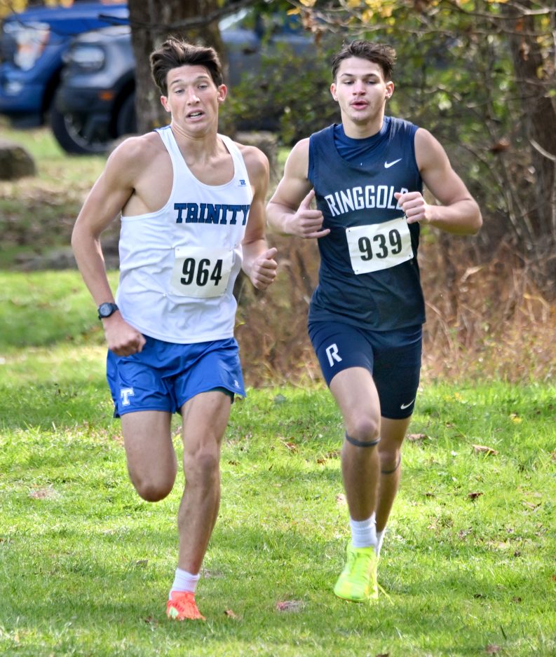 Ringgold senior Dravin Everley takes an early hill at the heels of Trinity senior Devin Junko in the Washington County Coaches cross country meet at Mingo Park on October 14.